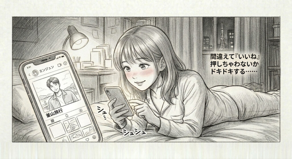 3年前に彼が行った釜山旅行の写真や、彼が「お気に入り」として紹介している音楽。それらを一つずつ辿っていくのは、私にとって彼という人を深く知るための大切なステップです。画面の中の彼は、眼鏡をかけて仕事に集中していたり、友人と楽しそうに笑っていたり。