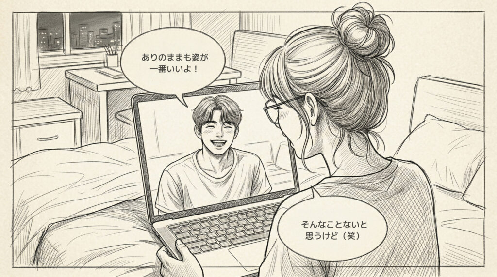 いつの間にか私たちのやり取りは、文字だけでなくビデオ通話が中心になっていきました。初めて「顔を見て話そう」と言われたときの焦りは、今でもよく覚えています。メイクを直して、照明を調整して、背景に映る部屋の散らかりを片付けて……。何度も鏡を確認したあの日。
