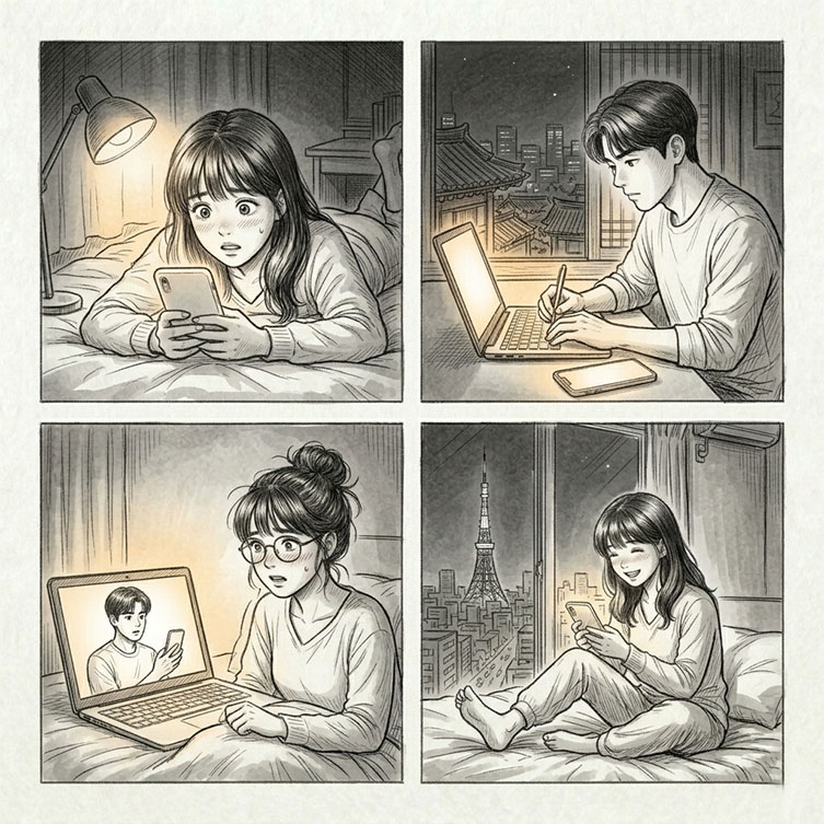 ソウルでの偶然の出会いから、少しずつ時間が経ちました。日本に戻ってからの私の生活は、以前とは少しだけリズムが変わった気がします。世田谷の静かな夜、窓の外を走る電車の音を背景に仕事をしていると、ふとした瞬間にソウルでの出来事を思い出します。