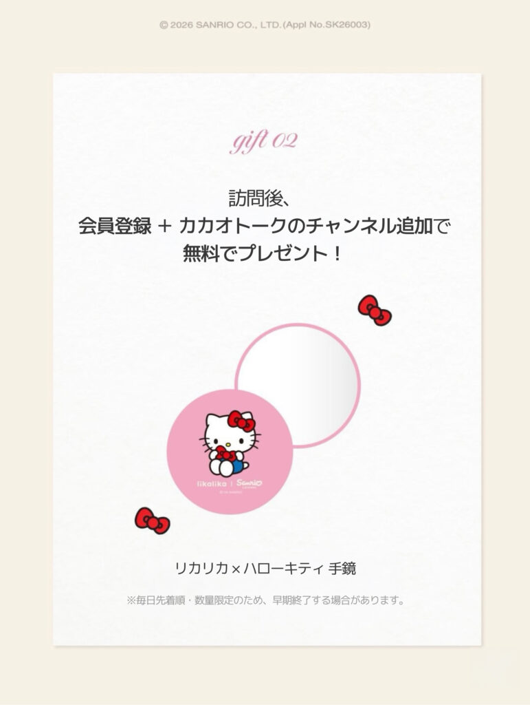 - 会員登録+カカオトーク友達追加で「ハローキティ手鏡」