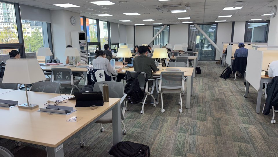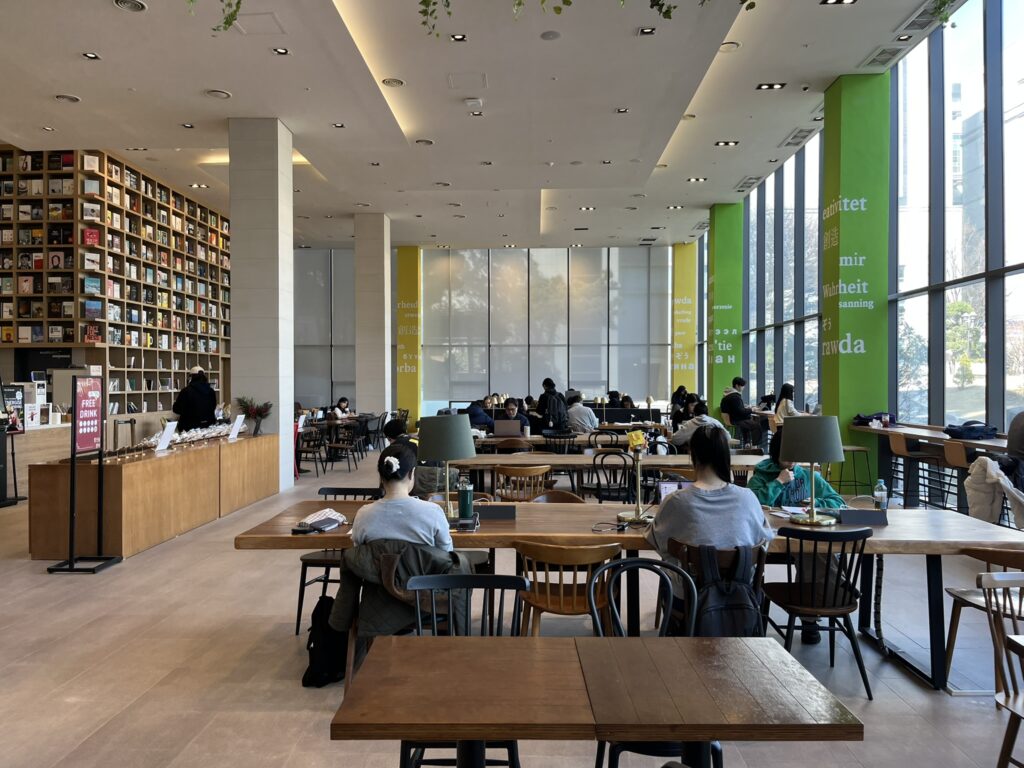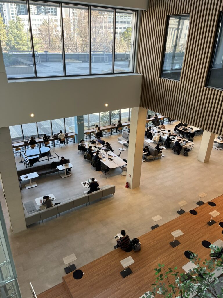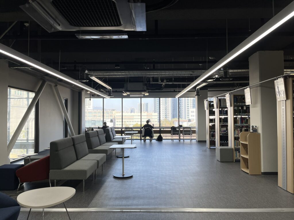 - 図書館: 最近新しく建てられたので、天井がすごく高くて壮大です!全面ガラス張りの窓越しに見える景色がとても綺麗なんですよ。 1階にはカフェがあり、パンやコーヒーも販売しているので、軽くお腹を満たすのにぴったりです。1階はちょっとした会話もしやすい雰囲気ですが、勉強に集中したいなら上の階を利用するのがおすすめです。