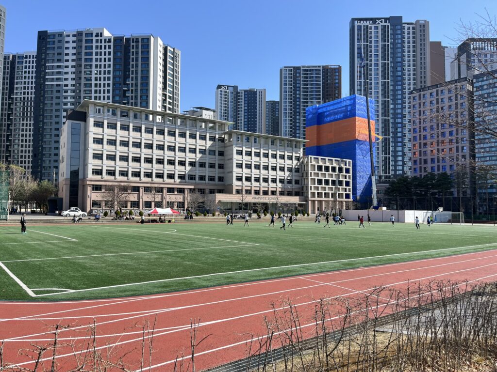 それから、正門から入ると右側に運動場があるのですが、芝生とランニングトラックが敷かれていて、視界が開けてスッキリとした開放感があります。