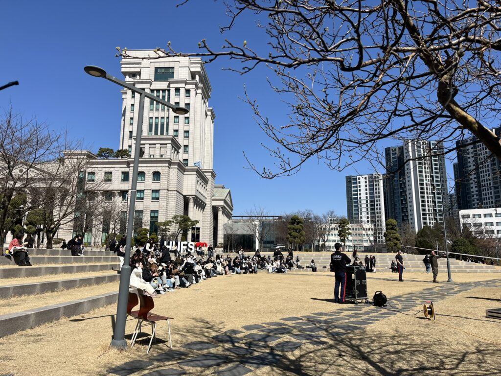 - 小さいけれど必要なものは全部揃っているキャンパス: 広場ではたまにイベントも開催され、プロモーション活動をしたりもします。 (この日は軍隊のイベントがあり、NCTのジョンウが来ていました)