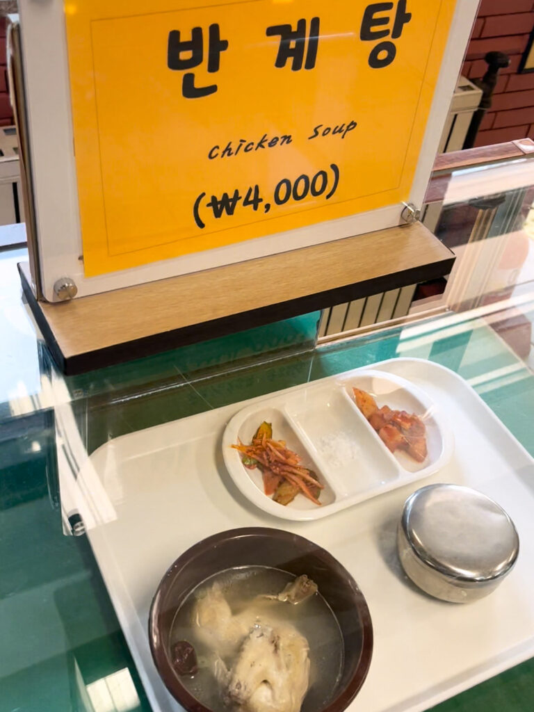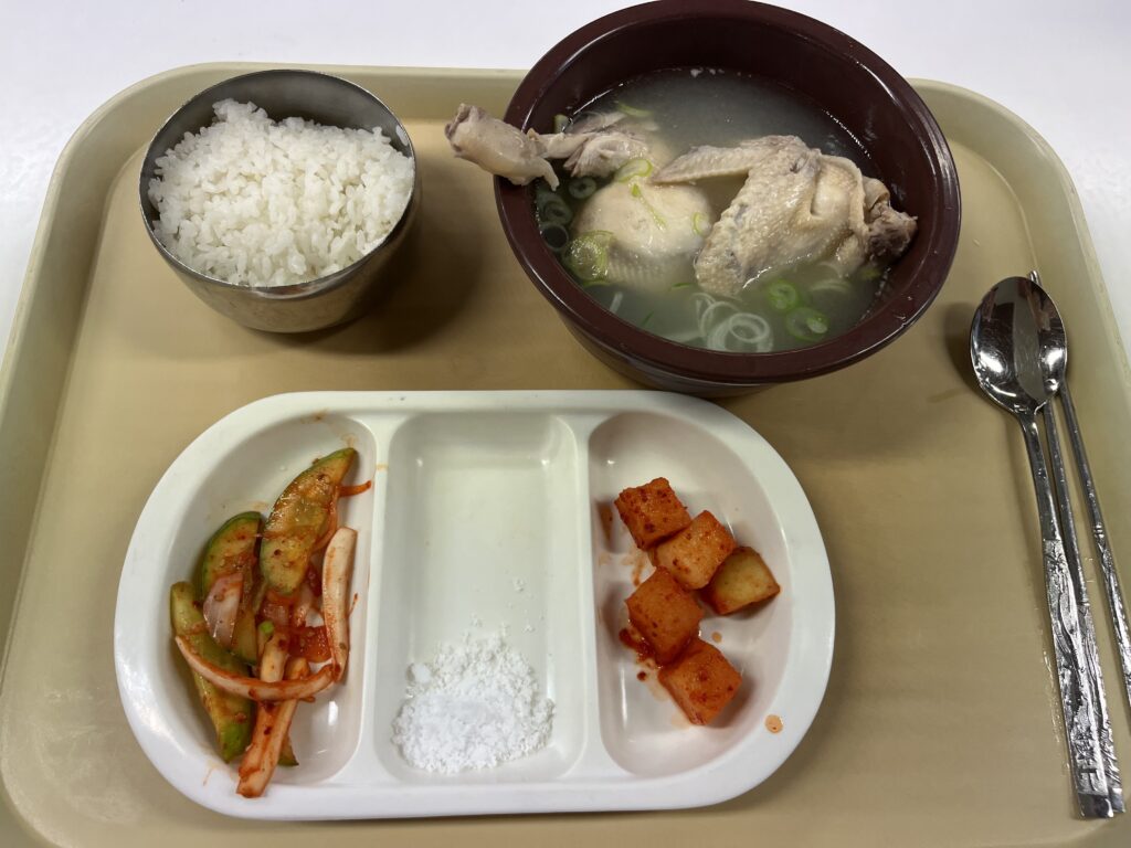 私は今日、半鶏湯(パンゲタン)を食べました。ちょっと物足りないですが4,000ウォンということを考えれば、十分です。