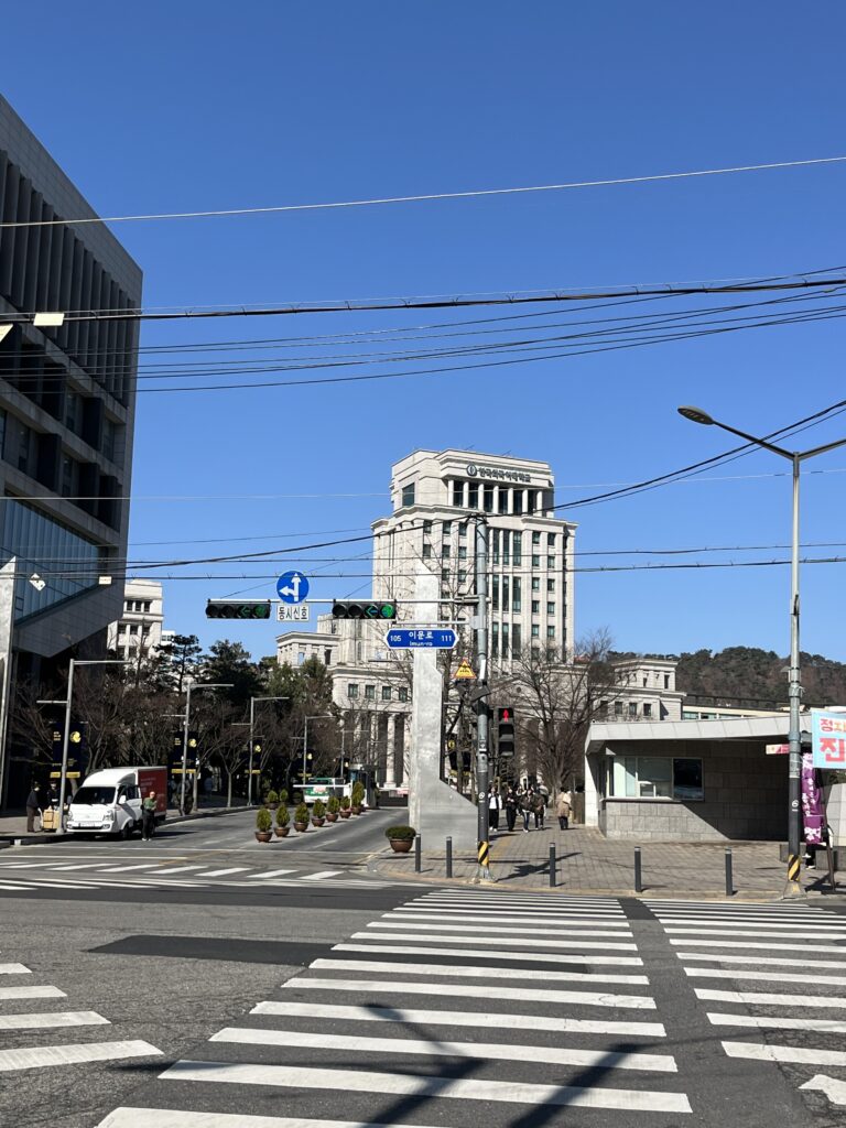 ネイバー地図(Naver Map)で見ると、正門までは徒歩5分、本館までは9分ほどしかかかりません。駅前の交差点まで来ると、「あぁ、学校に着いたな〜」とすぐ実感が湧いてくるんです(笑)