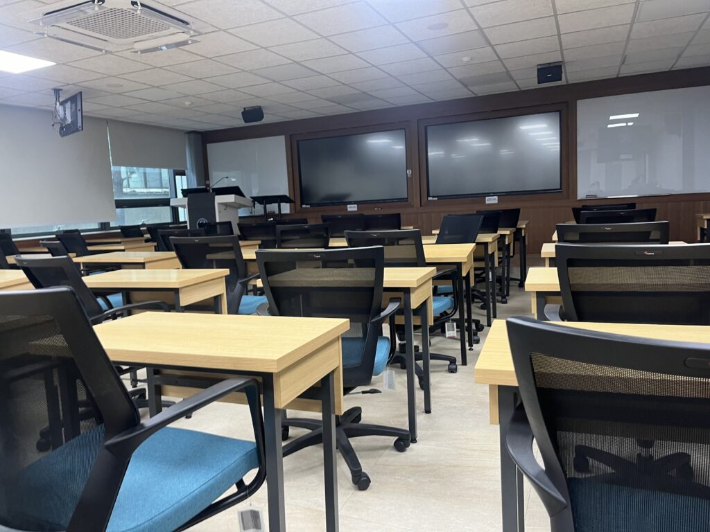 - 新築講義室(サイバー館内): 最近建てられた建物の講義室は、空間も広くて階段式になっている場所もあります。各席にノートパソコンやスマホ用の充電コンセントがあるので、利用するのもめちゃくちゃ便利です!サイバー館は主に経済・経営学部が使う建物なので利用する機会はなかったですが、羨ましかったです(笑)