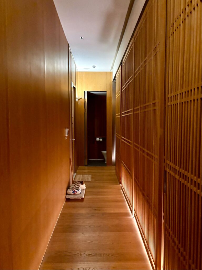 寝室とバスルームが建物中央の空間を挟んで完全に分かれて向かい合っていて、その間を長い廊下が繋いでいます。
