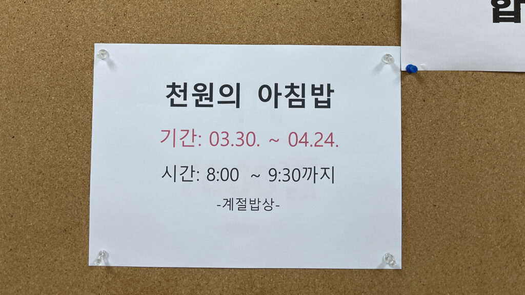 - 韓国の大学でよく実施されている「1,000ウォンの朝ごはん」は、ここでも行われています。