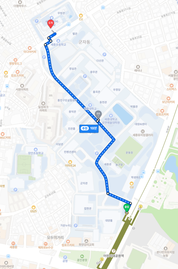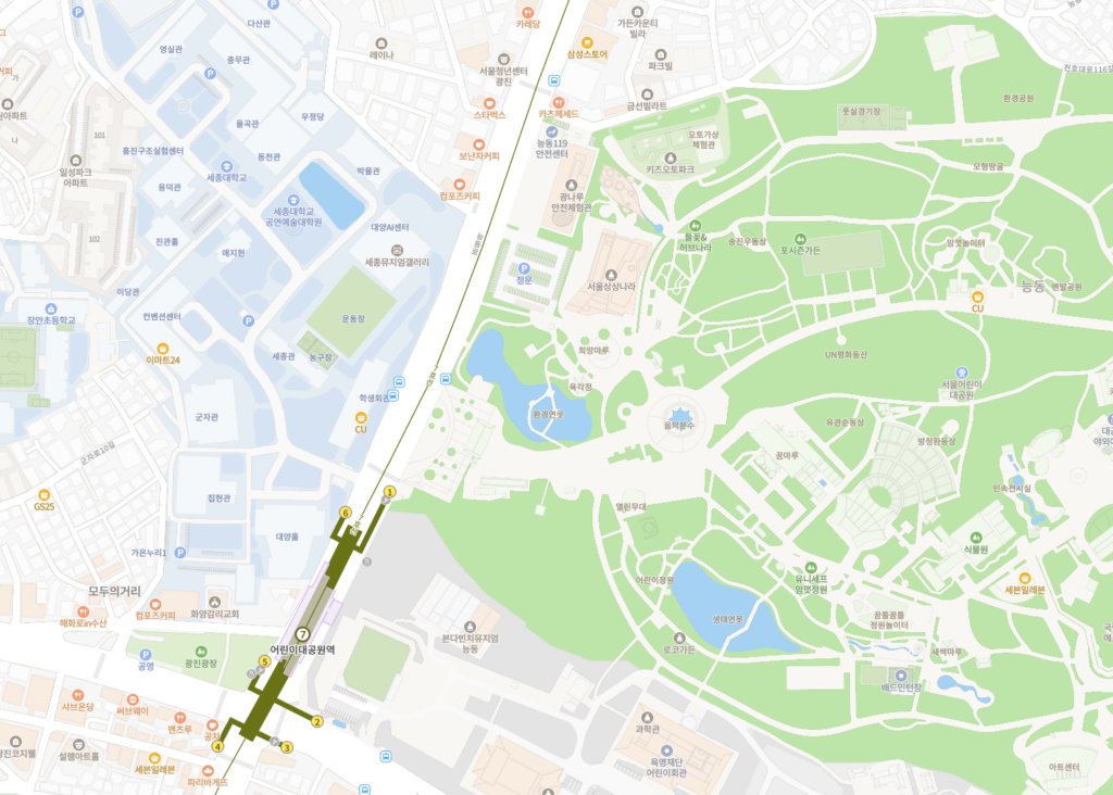 世宗(セジョン)大学は地下鉄7号線「子供大公園(オリニデゴンウォン)駅」に隣接しています。